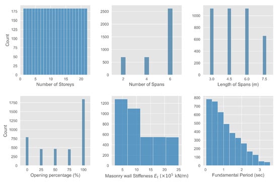 The dataset employed in the present study is the so-called “FP4026 Research Database” introduced by Asteris in 2016 [56]. The dataset consists of 4026 data points, corresponding to infilled reinforced concrete plane frames. For each frame, five structural parameters were recorded: (1) the number of stories, (2) the number of spans, (3) the length of the spans, (4) the stiffness of the masonry walls, and (5) the opening percentage, i.e., the percentage of the panel area covered by the infill walls. The corresponding fundamental period was estimated using the Seismostruct Finite Element Package [66]. The modeling of the infill walls followed the equivalent strut nonlinear cyclic formulation introduced by Crisafulli [67].