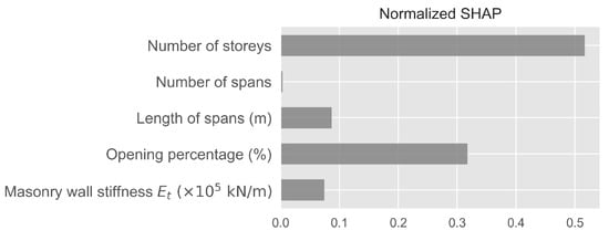 where are the SHAP values of the feature for the data point, N is the total number of data points and M is the total number of features. The results are shown in Figure 2. As can be readily observed, the most important features by far were the number of stories and the opening percentage of the panels, with an overall importance of approximately 50% and 30%, respectively. The stiffness of the masonry walls and the length of the spans had an overall effect of approximately 7–8%, respectively, while the influence of the number of spans was negligible.