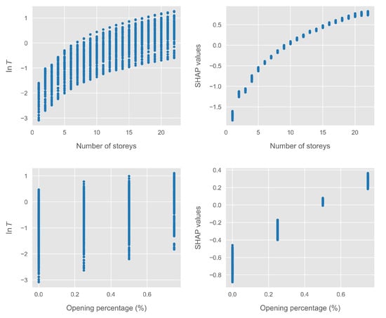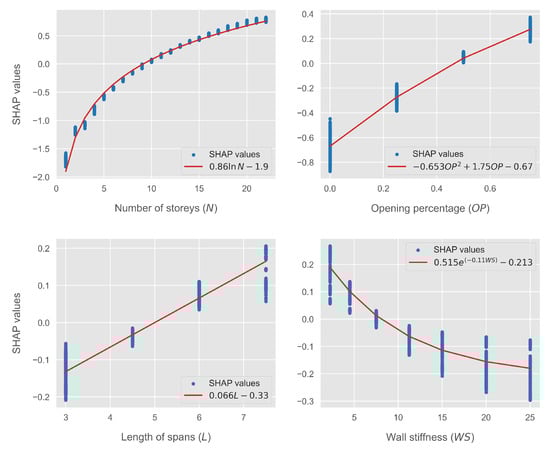 The core of the proposed formulation lies in providing analytical approximations to the obtained SHAP values. As discussed in Section 2.4, the SHAP values are additive and sum to the predictions of the ML model. Thus, the advantage of our proposed formulation becomes apparent, as it is possible to approximate the SHAP values of each individual feature and add as many terms as required to obtain the desired level of accuracy, guided by the feature importance hierarchy shown in Figure 2. The form of each individual analytical approximation is determined by the corresponding plot of the SHAP values. To demonstrate this, Figure 3 presents the scatter plots of the top two features, namely, the number of stories and the opening percentage, compared with the corresponding plots of the log-transformed fundamental period. For the opening percentage, we present the SHAP values corresponding to 0, 25, 50, and 75% opening percentage, as the bare frame case is treated separately.