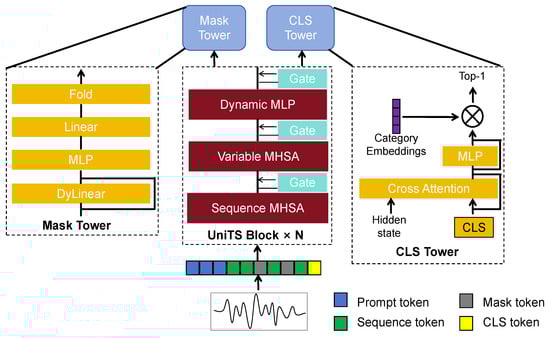 In February 2024, Shanghua Gao et al. introduced the UniTS model []. This model is a unified, multi-task, time-series model suitable for prediction, classification, anomaly detection, and interpolation tasks. It can handle homogeneous time series with different variables and lengths. Illustrated in Figure 1, the UniTS model consists of multiple, stacked, repetitive modules known as UNITS blocks and a lightweight tower designed for both mask generation and classification. Each UNITS block integrates components such as multi-head self-attention (MHSA), variable MHSA, a dynamic multi-layer perceptron (MLP), and a gating module. The mask tower is responsible for generating task-specific masks, while the classification tower (CLS) is dedicated to handling classification tasks. The cross-attention mechanism processes tokens and performs classification predictions. Tested on 38 datasets, the UniTS model outperformed other models and demonstrated zero-shot learning as well as prompt-based learning capabilities. Its design features encompass task tokenization for enhanced flexibility and adaptability by converting task specifications into uniform token representation; a unified time-series architecture incorporating dynamic linear operators and dynamic MLP modules to effectively capture relationships between sequence points of varying lengths; and joint training of generation and prediction tasks utilizing masked reconstruction pre-training strategy to enhance feature learning ability.