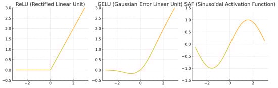 The mathematical representation of the SAF is depicted in (3). This function directly applies a sinusoidal transform to the input value, , converting the linear input into a periodic output, enabling the model to effectively capture the periodic characteristics of the input signal. Figure 2 illustrates the schematic diagrams of the ReLU, GELU, and SAF.