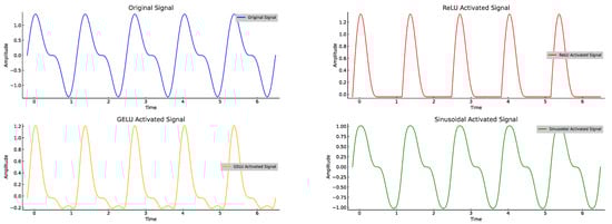 To compare the impact of different activation functions on processing the original periodic signal, we conducted simulations using periodic signals and applied them successively to the SAF, ReLU, and GELU, as depicted in Figure 3. The unique sinusoidal activation mechanism of the SAF enables it to more effectively capture and replicate the periodic variations in the signal, thereby preserving a greater proportion of its original periodic characteristics during processing.