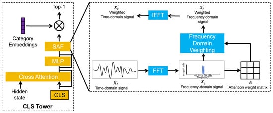 The introduction of the attention mechanism aims to replicate the human capacity for selectively focusing on specific key information while disregarding extraneous data []. When processing ENF data containing spectral information using deep learning models, we also endeavor to selectively process crucial spectral information while filtering out irrelevant details. Therefore, we devised a spectral attention module tailored for ENF data based on its unique characteristics and the underlying principles of the attention mechanism. The UniTS model incorporates a CLS tower (depicted in Figure 1) for classification tasks, with the inclusion of the spectral attention module preceding the category embeddings (as illustrated in Figure 4) within the CLS tower.