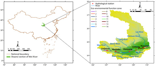 Water function zoning is the basis for the implementation of total water pollution control in river basins. It is a scientific basis for determining the dominant functions of different river reaches, formulating water environment quality standards, and carrying out water resources protection and management. According to the “Shaanxi Province Water Environmental Function Zoning”, the Wei River can be divided into 14 functional areas, as shown in Figure 1 and Table 1. The main pollutants in the Wei River are chemical oxygen demand (COD), NH3-N, total phosphorus (TP), and dissolved oxygen (DO) [34,35,36], among which COD and NH3-N are the most important pollutants in the Shaanxi section of Wei River. Therefore, COD and NH3-N are the main research objects in this paper.