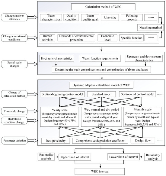 The overall framework of the dynamic adaptive calculation for WEC is shown in Figure 2. This method starts from the dynamic nature of WEC [38], adaptively selects the calculation method of WEC according to different river attributes and external conditions, and studies the establishment of a dynamic adaptive calculation method for WEC, which provides a scientific basis and technical support for the calculation of river WEC in a dynamic and changing environment. The specific steps are as follows: (1) Summarize the applicable conditions, focusing directions, consideration factors, advantages and disadvantages, the data requirements of the existing WEC calculation methods, analyses and classify the WEC calculation methods [39,40], so as to guide the selection of methods suitable for different research areas. According to the various attributes and actual conditions of the study area, the calculation method of WEC is selected adaptively. (2) Based on an in-depth analysis of the influence mechanism of changing factors, such as environment, demand, and conditions, on the traditional calculation model of WEC [41], a dynamic calculation method for WEC is established to cope with the changing environmental conditions. (3) The dynamics of time scale, model, guarantee rate, and parameter provide four ways of realizing the dynamic calculation for river WEC, based on an integrated platform for a WEC dynamic calculation simulation system to realize the dynamic application. The combination of calculation and application dynamics finally forms a dynamic calculation model for WEC. (4) Based on the dynamic calculation method for WEC, the results obtained under various changing environmental conditions are integrated into an interval, and an interval expression for WEC is proposed. A dynamic adaptive mechanism for WEC is established to adapt to dynamic environment changes, resolve risks caused by changes, and improve the quality of decision-making services.