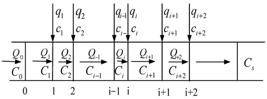 In the figure, and are the concentration and discharge of water quality in the upper reaches of the river reach, respectively; and are the concentration and discharge of sewage at the sewage outlet, respectively; is the concentration of pollutants after mixing; and is the concentration of pollutants in the downstream section at the distance from the sewage outlet. Then,