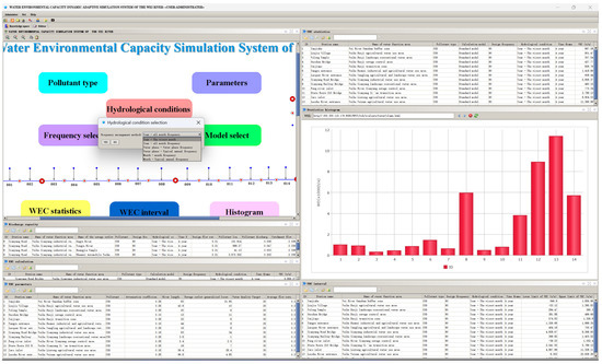 Figure 7 shows the calculation results of the WEC in the Shaanxi section of the Wei River. The first table on the left-hand side of the figure shows the statistics on the discharge volume of each sewage outlet in the Xianyang industrial water area of the Wei River. The middle table is the WEC results for the Xianyang industrial water area of the Wei River, and the bottom table is the statistics on WEC parameters. The first table on the right-hand side of the figure is the statistical results of WEC, in the middle is the histogram of the WEC for water function areas, and the bottom table is the calculation result interval of WEC in the water function area. By clicking on the hydrologic condition node, the selection box in the upper left-hand corner of Figure 7 will appear. You can select the frequency arrangement method and calculation time scale, and click the nodes of “Model selection”, “pollutant type”, and “Guarantee rate selection” to select the corresponding contents, so as to realize the dynamic adaptive calculation for WEC.