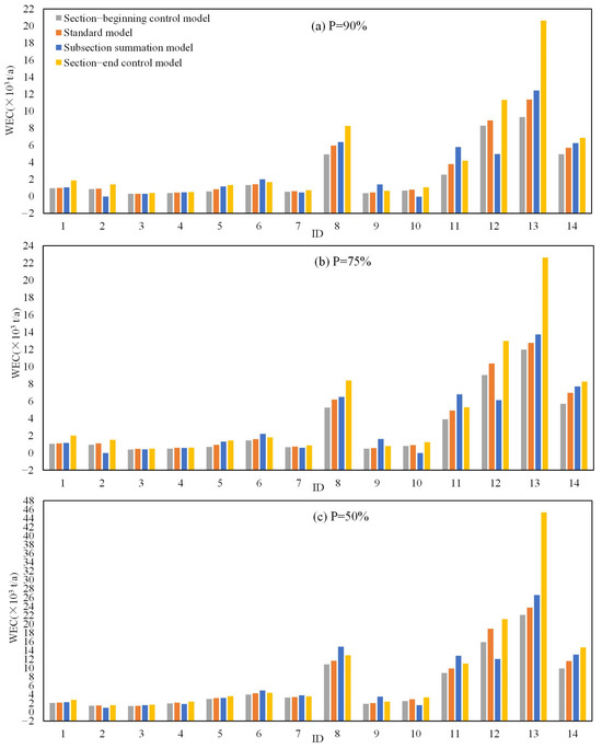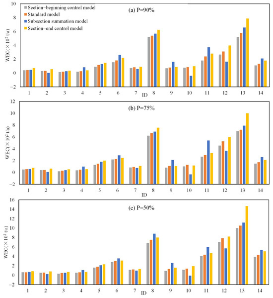 Based on the comprehensive analysis of Figure 8 and Figure 9, it can be seen that the WEC calculation results of the four calculation models of nearly half of the water function zoning follow the rule of the section-end control model > the subsection summation model > the standard model > the section-beginning control model. However, the WEC calculation results of the subsection summation model in water function areas 2, 10, and 12 are the smallest, and the WEC calculation results of the subsection summation model water function areas of 6, 9, 11, and 14 are the largest, which is due to the characteristics of the model. The subsection summation model takes into account the influence of tributaries and water intakes when calculating the WEC. There are large water intakes in the 2, 10, and 12 water function areas, and large tributaries in the 6, 9, 11, and 14 water function areas. The water intake reduces the flow, resulting in the WEC also being small. On the contrary, the tributary increases the flow, leading to the WEC increasing. It shows that the larger water intake and tributaries in the water function area will affect the size of WEC. In addition, it can be seen from Figure 8 and Figure 9 that among the 14 water functional areas in the Shaanxi section of the Wei River, the WEC of the Weinan agricultural water use area (ID:13) is the largest, and the WEC of the Baoji agricultural water use area (ID:2), Baoji landscape area (ID:3), and Xianyang sewage control area (ID:10) are the smallest. By analyzing the WEC of different design frequencies in Figure 8 and Figure 9, it can be concluded that WEC is negatively correlated with the size of design frequency, that is, WEC decreases with the increase in design frequency.
