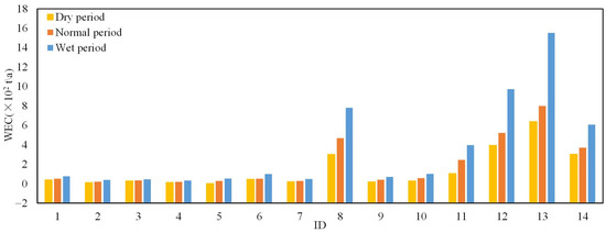 It can be seen from Figure 10 and Figure 11 that the WEC of each water function area is relatively large during the wet period and relatively small during the dry period. In practical management and planning, decision-makers can formulate corresponding pollutant emission control strategies and water resources protection measures based on the characteristics of WEC in different periods.