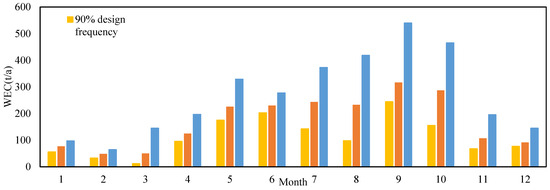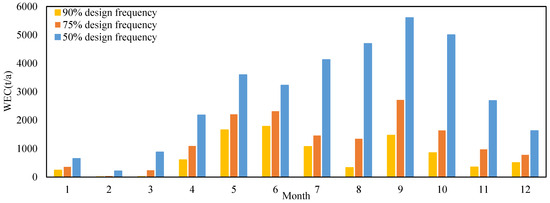 It can be seen from Figure 12 and Figure 13 that the monthly WEC within the year is significantly different. The WEC in September is the largest from January to December, accounting for approximately 16.53% of the annual WEC. This is followed by October and August, which together account for about 25.13% of the annual WEC. The third largest WEC values are observed in July and May, while the WEC in June is slightly smaller. The WEC in February and March is the smallest relatively, accounting for only 1.73% of the annual WEC. The monthly WEC throughout the year is ranked as follows: September > October > August > July > May > June > November > April > December > January > March > February.
