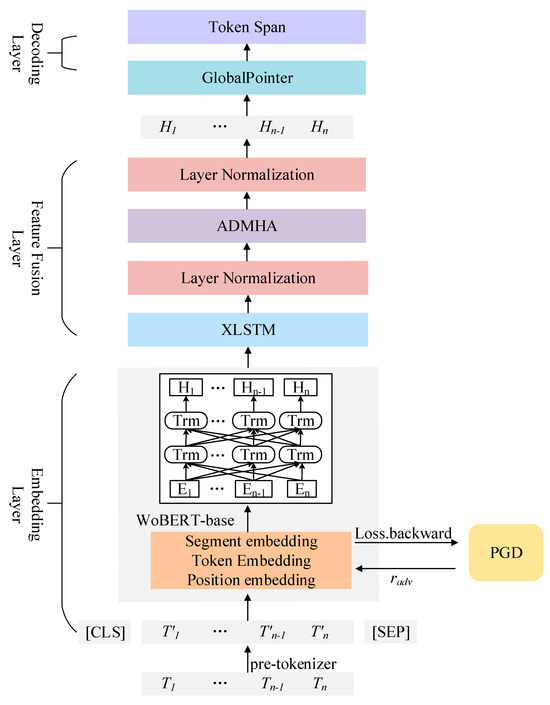 From the above studies, it is evident that span-based methods offer certain advantages in NER tasks. However, when dealing with Chinese texts containing complex contexts and polysemous words, models often exhibit limitations. To address these issues, this study proposes using GlobalPointer as a decoder to process entity representations. However, GlobalPointer lacks the ability to effectively utilize contextual semantic information. Therefore, this paper introduces a Chinese Named Entity Recognition model based on multi-level representation learning: WP-XAG. The model utilizes the word-based pre-trained model WoBERT, and during training, incorporates PGD to introduce perturbations, improving the model’s generalization ability. Considering that using only the XLSTM network in the feature fusion layer may lead to suboptimal performance in handling complex sequences and that the fixed weights of multi-head attention restrict the model’s adaptability to different contextual features across varying scenarios, this paper proposes adaptive multi-head attention (ADMHA) to enhance semantic connections. Finally, GlobalPointer is employed as the decoder to construct an entity matrix, capturing global entity information to achieve accurate entity recognition.