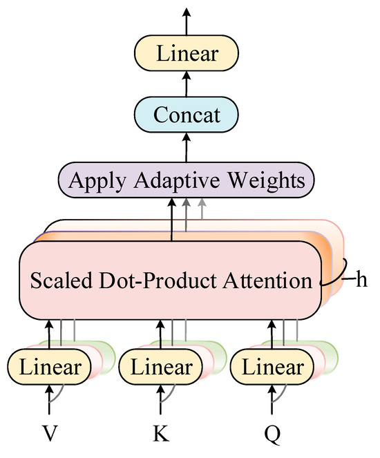 where WQ, WK, and WV are the weight matrices, and dk represents the dimensionality of Q and K. The division by acts as a scaling factor to prevent excessively large dot product values, which could lead to vanishing gradients. The final result is obtained by applying the SoftMax function and multiplying by V. In ADMHA, Equation (17) represents the computation of a single head in the multi-head attention mechanism. Equation (18) describes the calculation of adaptive weights. Equation (19) illustrates the application of the adaptive weights to the output of each head. Finally, Equation (20) shows the combination of the outputs from all heads. The structure of ADMHA is illustrated in Figure 3.