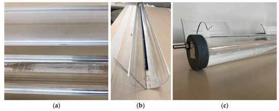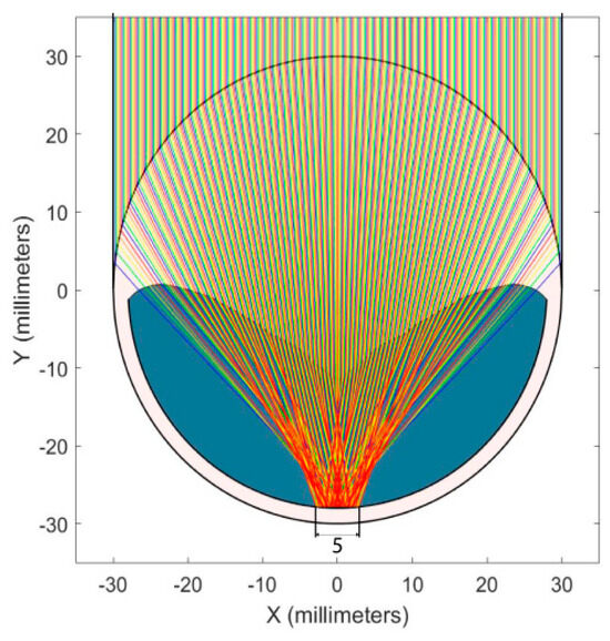 The optical system was based on a combination of two optical elements that concentrated the incident solar irradiance onto a linear-focus receiver. Figure 1 illustrates the cross-section of the two designed optical systems. The first element, where the rays initially arrive in Figure 1, had two different surfaces, one on the exterior and the other in the interior. The external one was a half cylinder, and the internal one was a free-from non-transverse profile surface that was optimised as a function of the inner liquid. The second element was a dielectric liquid (coloured in blue in Figure 1) that filled the cavity formed between the solid internal surface of the first optical element and a cylindrical transparent casing. In other words, from the outside, the optical system looked like a cylindrical rod. The cylindrical casing was made of polymethyl methacrylate (PMMA), and there were two configurations: one had the cylinders filled with deionised water (DIW) and the other with isopropyl alcohol (IPA). In the next subsection, the motivation to choose these two liquids is explained.