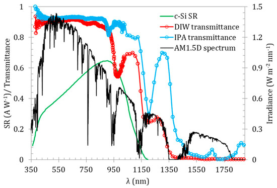 Spectral response (SR) of the utilised crystalline silicon (c-Si) cells. Transmittance of DIW, IPA and AM1.5D solar spectrum [41].