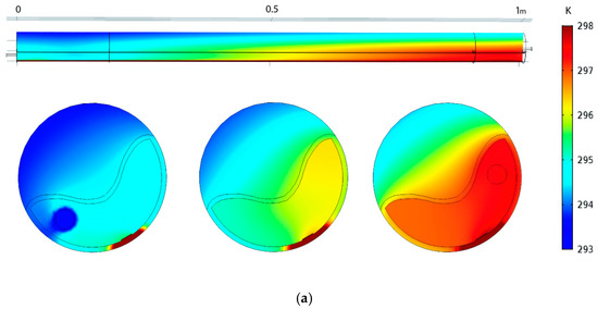 Figure 3 shows the plots of representative temperature contours for both configurations. Longitudinal and cross-sectional views are presented. It can be observed that due to the shape of the IPA cavity, the PV-cell area was a bit warmer than in the case of DIW. On the other hand, the greater proportion of PMMA solid body was more efficient in isolating the system from the exterior. It can be noted that the inlet was located at the bottom part of the cavity and the outlet was located on the top, in agreement with the flow lines/path traced by the liquid. The flow lines were obtained by means of multiphysics simulations, combining fluid mechanics and energy equations.