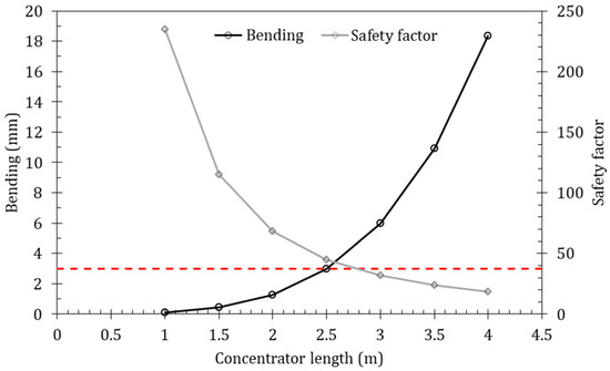 Maximum displacement (bending) and safety factor as a function of the module/concentrator length.