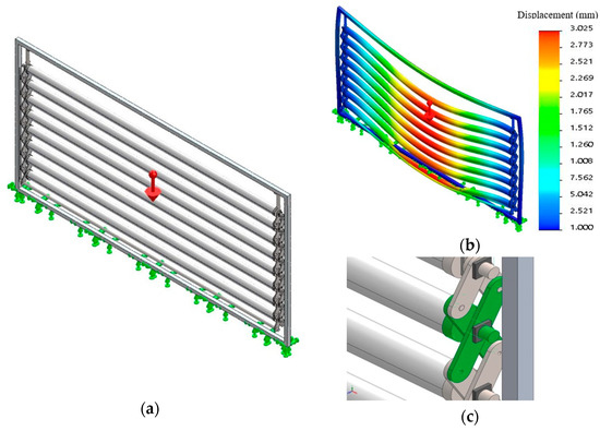The present study was conducted considering an assembly comprising concentrating elements whose numbers ranged from 8 to 32. Figure 5 shows the 8-element configuration (Figure 5a), the displacement with respect to the initial position (Figure 5b) and details of the connecting rods, the lateral covering of the optical element and the supporting axle with a block piece to avoid displacement of the connecting rods along the length of the axle (Figure 5c). The diameter of the axle was found to be critical in terms of concentrator bending, being necessary to maintain a diameter of 2 cm in order to obtain a maximum displacement of 3 mm. The thicknesses of the connecting rods ranged from 2 to 4 mm, depending on the number of concentrating elements. In both cases (connecting rods; axle), standard stainless steel was used.