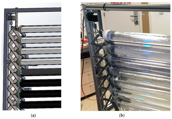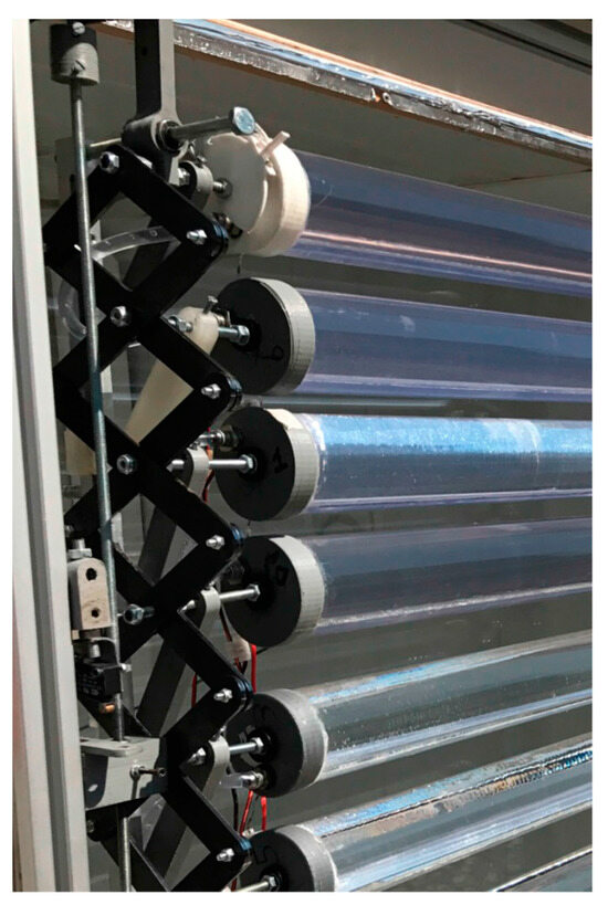 Figure 9 shows details of the scissor-mechanism rods that allow separating or approaching the individual concentrators. A 3D-printed white component located at the edge of the top concentrator that had the two photoresistors mentioned above for solar-tracking purposes and a shading element can be seen.