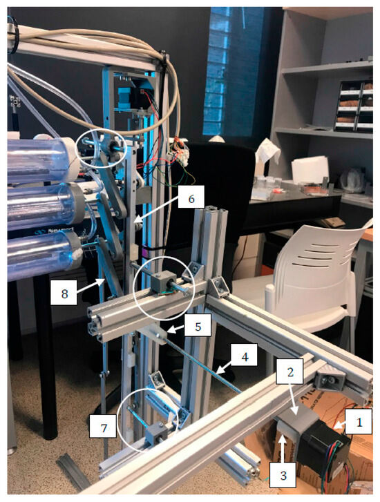 Figure 10 shows all parts of the proposed system that produced the rotation of the concentrators to track the solar altitude. The motor holder structure was attached to the main frame, and there were different options to hold the motor in place. It is important to note that this prototype did not have the final dimensions and will be further optimised to reduce the space occupied. From right to left, the first element of Figure 10 is the motor (component no. 1). This was a stepper motor similar to the one utilised for the translational motion produced by RS (model 892-8732). The motor was fixed to the structure by means of a square printed PLA (polylactic acid) (Figure 10: no. 2). The motor shaft and the spindle were coupled by means of a PLA-printed element, white in colour (Figure 10: no. 3). The spindle consisted of a metric six-threaded rod (Figure 10: no. 4). The component no. 5 (Figure 10) is the nut support of the spindle nut mechanism. Figure 10 shows how the piece printed in PLA houses the nut. This piece was joined by four screws and was connected to an aluminium guide (Figure 10: no. 6). The guide groove was fabricated using the previously mentioned numerical control machine. In order to guarantee that the movement produced by the nut spindle mechanism was equally transmitted to each part of the guide, three support elements were incorporated. These components are indicated by circles (Figure 10: no. 7). Two of them were fixed to the extruded-aluminium components. More specifically, a bolt was threaded into the guide and fixed by means of a piece printed in PLA (grey in colour) that housed a linear bearing. When testing the movement, unwanted movement was observed. To cope with this problem, a third bolt was added. This bolt was fixed to the frame by means of a piece printed in PLA (grey in colour) with a linear bearing. Lastly, the elements no. 8 (Figure 10) are the eccentric connecting rods that connected the guide with the axle of the cylinders and caused rotation. These components were made of grey PLA, and the axle (or pivot) that moved in the guide had a bolt. This configuration minimised friction related to movement. Additionally, the guide was lubricated with graphite powder.
