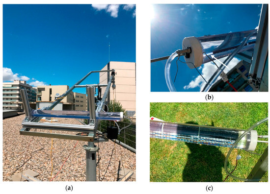 Characterisation of the modules: (a) A PV module mounted on a two-axis tracker together with a pyrheliometer and a pyranometer for solar radiation measurements, (b) details of the hydraulic connection and the concentrated light, (c) details of the module concentration effect.