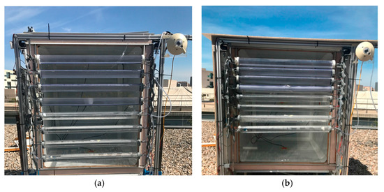 The system, with a gross aperture area of approximately 1 × 1 m2 and 8 concentrator modules (4 modules with DIW circulating in series through all of them and 4 modules with IPA in a similar way), was installed on a specially built testing unit. The system was monitored and the thermal/electrical characteristics were obtained. Its effect on the temperature/illumination in the interior space of the testing unit was examined. In order to investigate the behaviour of the proposed system, taking into account building integration and the effect of the system on the interior temperature and illumination, two testing units were built. These testing units had the same dimensions and materials—1 × 1 × 1 m3 cubes with all the walls made of prefabricated sandwich panels of 10 cm thickness—except the one oriented to the south (in this case, a sheet of methacrylate (8 mm thickness) was used). Both testing units (Figure 12) were oriented to the south. Moreover, both testing units were placed 50 cm above the ground to minimise the albedo effect. It should also be mentioned that the differential thermal and illumination effects in the interior space were evaluated.