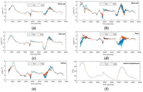 Comparison of heat flux (q) and temperature (T) of the twin testing units (TU1 and TU2): (a) north wall, (b) west wall, (c) east wall, (d) floor, (e) ceiling and (f) interior temperatures.
