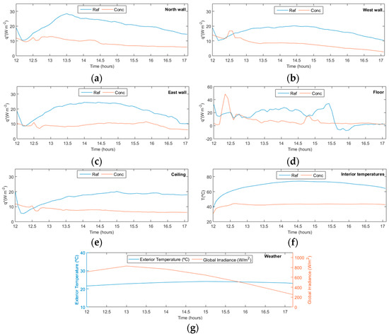 Comparison of heat flux (q) and temperature (T) of the twin testing units with concentrator (TU1-Conc and TU2-Ref): (a) north wall, (b) west wall, (c) east wall, (d) floor, (e) ceiling, (f) interior temperatures and (g) weather information.
