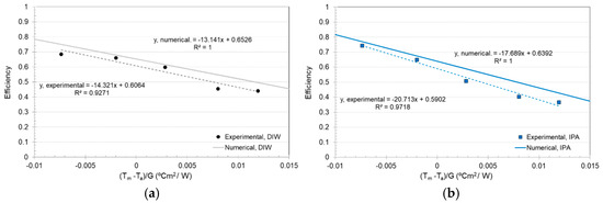 Furthermore, numerical and experimental stationary thermal characteristic curves were determined for both concentrator configurations (DIW and IPA). As can be seen in Figure 16, the heat-loss coefficients are high: the values range from around 14 to 20 W °C−1m−2 (experimental and simulated wind velocity is 2 m/s). This is attributed to the fact that the solar collector morphology (glazing) was optimised for concentrating the incident irradiance but not for minimising heat losses. These losses could be reduced by embedding vacuum layers into the system with minor design changes, but the fabrication of such systems could not be conducted at the available facilities. Good agreement between experimental and numerical values was obtained. Minor discrepancies are mainly attributed to wind speed fluctuations around the value of 2 m/s (steady-state experiments).