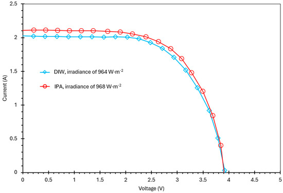 In Figure 17, the average IV (electric current–voltage) curves of DIW and IPA modules can be seen. As shown in Figure 17, these curves were obtained under similar direct-irradiance conditions (around 965 Wm−2). Furthermore, the temperatures were controlled. More specifically, the temperatures were maintained close to 25 °C (26.4 °C for the DIW option; 26.8 °C for the IPA option). The FF was found to be 62.8% in the case of the IPA configuration and 61.7% in the case of the DIW one. The values of DIW were lower (comparing to those of IPA) but relatively close, as expected. It should be noted that negative impacts on Voc and especially on the FF, compared to the original cell, were observed. These effects are attributed to the following facts: (1) a reduction in the parallel resistance due to edge shunts and higher recombination rate, (2) an increased series resistance due to the six cells connected in series and (3) the limitation of maximum current by the most damaged cell in the series connection [43]. On the basis of these IV curves, the module average electrical power output was calculated. In both cases, a value of approximately 5.15 W was found. In addition, the experimental optical efficiency can be derived from the IV curves and the aforementioned electrical data by comparing the short-circuit current densities. The optical efficiency for DIW is 73%, and for IPA, 76%. As in our previous study for the optical design, the differences with the theoretical results are attributed to manufacturing inaccuracies [36].