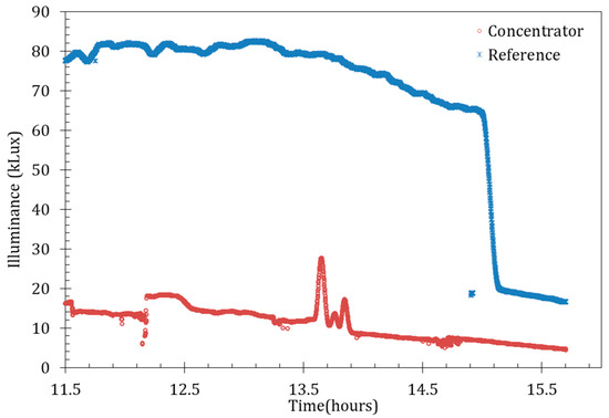 The illumination profile registered in the two testing units. The time refers to solar time. Concentrator = the testing unit with the concentrating system. Reference = the reference testing unit (without solar concentration).