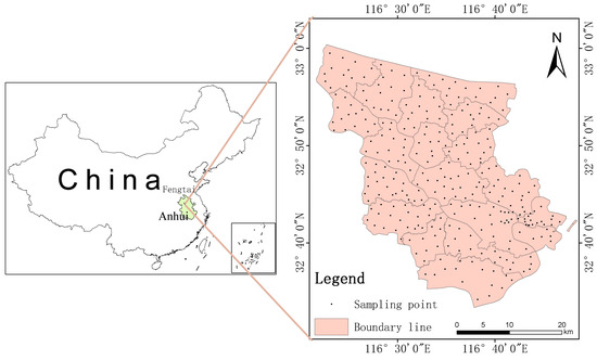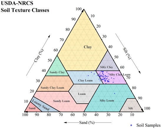 Situated in central Anhui Province, the study area lies in the midsection of the Huai River. It is geographically positioned between 116°52′02.1″ E and 116°56′19.0″ E longitude, and 32°34′45.5″ N and 32°36′38.9″ N latitude. It is located in the transition zone between the subtropical zone and the warm temperate zone. The climate characteristics are obvious, the four seasons are distinct, the annual average temperature is 15.3 °C, the annual average frost-free period is 224 days, and the precipitation in the four seasons is relatively average. The annual precipitation is 937.2 mm, and the average annual sunshine is 2609.9 h. Due to the superior light conditions, abundant heat, moderate precipitation, and long frost-free period, it is suitable for planting food crops and economic crops such as soybeans, wheat, rice, and rapeseed. The study area is the Jianghuai Plain area, and the terrain is a low hilly area with little ups and downs. According to the soil classification of WRB, the soil types of sampling sites in the study area include Gleyic Fluvisols, Haplic Fluvisols, Ferric Luvisol, and Anthraqui-Stagnic Luvisol. The physical properties of the typical soil in the study area are shown in Table 1, and the soil texture of sampling points is shown in Figure 1. Most of the sampling points are A-B-C and A-B-C-D. The color of the whole section is yellowish brown to brown, the clay plate appears above 20 cm, and the texture is heavy soil to clay. From massive to prismatic structure, there are new bodies such as iron–manganese binding and dark film, and their number is increasing from top to bottom.