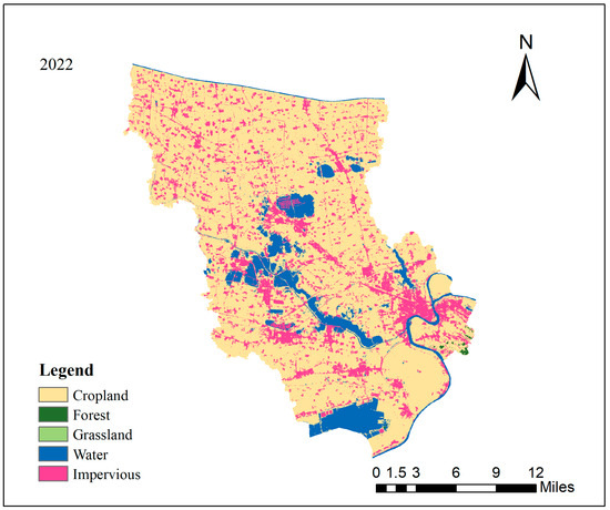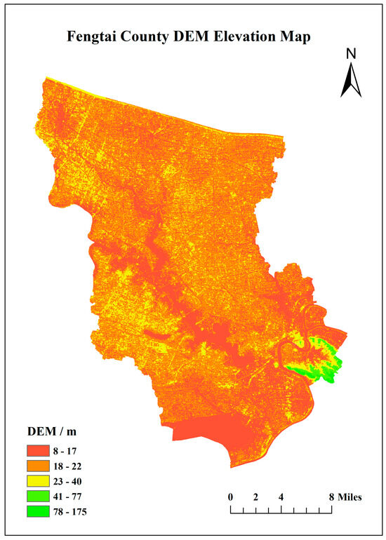 Based on the way of land use, the sampling units are divided into administrative village-level units and cultivated land area, and the sampling principle of random distribution of the system is combined with the latest GF satellite image data to adjust the point error. Finally, the sampling point is determined by an on-site field survey. A total of 306 sampling points were set in the study area (Figure 2), and the elevation of the study area is shown in Figure 3. These sampling points were located in the rice–wheat rotation field, and GPS was carried out to record the location of the sampling points, and multi-point mixed sampling was carried out according to the diagonal method (The specific distribution of cropland land in the study area can be referred to Figure 4). The sampling time was April 2023, and the five-point sampling method was used to set up 1 × 1 m standard plots with each sampling point as the center, with a total of 306 plots. Five sampling points (diameter of 0.15 m) were set along the double diagonal direction in the plot, and the profile analysis (0–100 cm) was carried out at the center of the plot. The ring knife method was used to sample (0–15 cm, 15–30 cm, 30–100 cm), and each layer was repeated three times as a physical property test sample. In addition, the topsoil (0–20 cm) of the five sampling points in the plot was mixed, and the excess samples were discarded by the quartering method. The final sampling amount was 1–2 kg. We removed the foreign bodies such as stone particles and plant roots contained in the soil, put them in plastic bags, attached labels, recorded the number, coordinates, profile depth and other information, and brought them back to the laboratory for analysis. In May 2024, a 1 × 1 m plot was set up for 306 sampling points recorded by GPS, and all mature wheat on the plot was harvested and brought back to the laboratory for analysis.