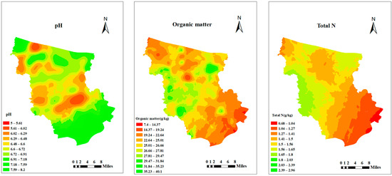 In Fengtai County, the soil demonstrates a pronounced correlation between organic matter, total nitrogen, and alkali-hydrolyzable nitrogen, with their spatial distribution patterns being notably alike. Their respective nugget ratios stand at 89.1%, 98.8%, and 99.8%. When compared to other indicators, their range of variabilities is relatively vast with values of 462 m, 415 m, and 777 m. The global Moran’s I index values for these elements are notably high, listed as 0.682, 0.783, and 0.876. This indicates that across a broad spectrum, their spatial differences are predominantly affected by random determinants, like human activities or fertilization methods. Their distribution appears concentrated, forming a patch-like appearance on nutrient maps. This may be attributed to organic matter and total nitrogen content being related to the distribution of nitrogen fertilizer [38]. The diverse agricultural practices among farmers result in the uneven distribution of these elements within the county. Notably, the variation coefficients for these factors are smaller when juxtaposed against other indicators, with values of 21.04%, 20.53%, and 19.45%. This suggests a lower general dispersal and a shift from fragmentation to uniformity in their dispersion. Both total nitrogen and organic matter critically impact crop yields [39]. Their concentrations are intrinsically linked to land use approaches, soil classifications, and the introduction of organic fertilizers [40,41]. In regions with diminished levels of organic matter, total nitrogen, and alkali-hydrolyzable nitrogen, adopting practices like straw return [42], deep tilling [43], organic crop rotation [44], and intercropping [45] can markedly elevate the soil’s organic matter and nitrogen content.