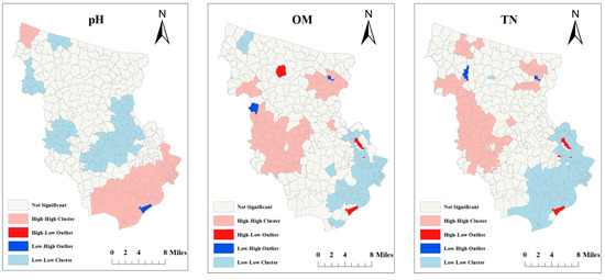 The local Moram’s I index divides the study area into 5 scenarios: ① Insignificant type: No significant spatial correlation, showing a random distribution. ② High–High type: Regions with clustered high values. ③ High–Low type: Areas of low values surrounding regions of high values. ④ Low–High type: Areas of high values surrounding regions of low values. ⑤ Low–Low type: Regions with clustered low values. LISA (Local Indicators of Spatial Association) cluster maps can represent the correlation of soil properties in localized areas.