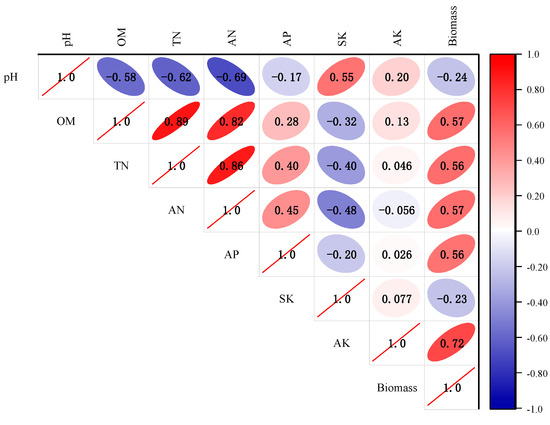 From Table 5, it can be seen that the index with the largest load value in the first principal component is total nitrogen content, and the index in the range of 10% is organic matter content and alkali-hydrolyzed nitrogen. Both of these two indexes have a high correlation with wheat biomass (R = 0.57, 0.57, p < 0.01), so total nitrogen, organic matter and alkali-hydrolyzed nitrogen are selected into MDS. In the second principal component, only available potassium content was a high factor load index, so available potassium was selected for MDS. In addition, available phosphorus was also significantly positively correlated with wheat biomass (R = 0.56, p < 0.05). Considering that soil-available phosphorus is closely related to crop growth and is an inherent property of soil, reflecting the nutrient supply capacity of soil to plants, soil-available phosphorus was selected into MDS. In summary, five indicators of total nitrogen, organic matter, alkali-hydrolyzable nitrogen, available phosphorus and available potassium were finally selected into MDS for SQI calculation. In addition, in order to better reflect the impact of various soil nutrient indicators on wheat biomass, we used Pearson correlation analysis to further explain it, as shown in Figure 7.