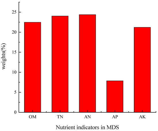 A linear scoring method was used to convert the soil indicators of the minimum data set into scores. The score weights of the selected indicators are shown in Figure 8 below. Finally, the SQI is calculated by adding the standardized indicator values and their weighted products to the minimum data set. The formula of SQI is as follows: