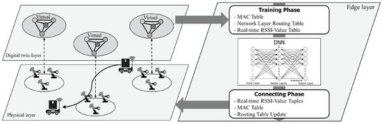 The proposed digital twin network (DTN) architecture consists of physical, digital twin, and edge layers, as shown in Figure 1. IIoT devices in the physical layer are mapped to the digital twin layer. Then, the connectivity construction framework is designed for time-sensitive applications to maximize the data rate communication in the edge layer. In a smart factory, mobile devices need to connect with each other frequently for real-time manufacturing systems. Time-constrained communication for handling devices in the manufacturing cells and logistics sectors is one of the important demands to avoid faults and improve overall manufacturing automation efficiency for a smart factory. Thus, reliable and connective communication among devices should be constructed to support mobility.