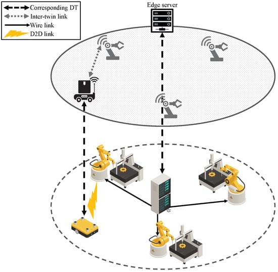 To assist communication between the mobile and relay nodes, D2D links are established, as in Figure 2. The physical layer consists of various types of IIoT devices, including industrial mobile robots and various machines. The relay nodes connected to the mobile node receive the sensing data and transmit them to the edge server. Then, the relay nodes can communicate with the edge server through wired communication to relay information or data. The edge server sets up DTNs for IIoT devices within its coverage area. In the edge layer, DTNs can construct a network, which mirrors the real physical network with the corresponding DT. Therefore, the DTs can communicate information with each other through inter-twin communication. In addition, interaction communication management enables real-time communication between a physical device and its corresponding DT. In this paper, we consider a network scenario consisting of a manufacturing cell. In the manufacturing cell, multiple mobile and relay nodes directly establish D2D links to transmit data to each other. To guarantee the channel quality of cellular links, the signal-to-interference plus noise ratio (SINR) between the mobile node and relay node must be bigger than the threshold k. We can obtain the SINR function, which can be defined as