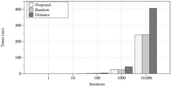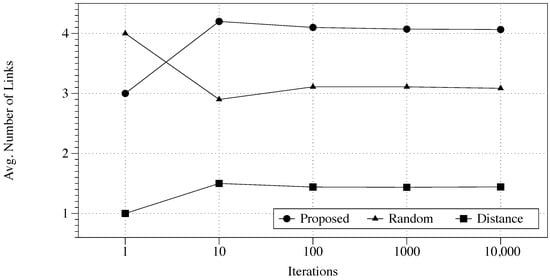 Figure 3, Figure 4 and Figure 5 show the average sum data rate and the average number of links obtained with different iterations for the mobile node. In each iteration, the number of mobile and relay nodes is set to five. Figure 3 shows the average sum data rate with respect to the number of iterations. It can be observed that each algorithm converges in more than 100 iterations. Furthermore, it is observed that the proposed model yields the highest sum data rate among the comparison models. This is because the mobile nodes are connected to the relay nodes with the highest data rate to maximize the data rate at each iteration. Figure 4 shows the average number of links for the mobile node with each iteration. Although the number of mobile nodes is set to five in each iteration, the average number of links is less than five. When the mobile node tries to connect to the relay node, it should satisfy the distance threshold being less than . If the distance between the nodes cannot satisfy the distance threshold, they are not connected. Furthermore, the proposed model connects to as many relay nodes as possible to increase the data rate. Therefore, the proposed model shows the highest number of links. In the distance scheme, the average number of links is lowest because this model only connects to the relay node that is near the mobile node. Figure 5 shows the seconds required for convergence. For 100 iterations, the times of the proposed, random, and distance schemes are 12.43, 12.57, and 20.34 s, respectively. Our results show that the proposed model converges within a few seconds for up to 100 iterations or equal. For 10,000 iterations, the times required for the proposed, random, and distance are 241, 242.98, and 407.70 s, respectively. These results demonstrate that the proposed model can be applied to real environments without high overhead for calculating optimization problems on the edge layer (i.e., server).