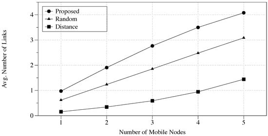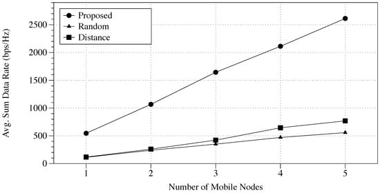 Figure 6 and Figure 7 show the effect of the number of mobile nodes on the average sum data rate and the average number of links, where each simulation corresponds to the average value of 10,000 iterations. Figure 6 shows the average sum data rate for the mobile node. It can be demonstrated that as the number of mobile nodes increases, the average sum data rate increases. However, the average sum data rate of the random and distance models increases slowly and is lower than that of the proposed model. This is because not all the mobile nodes are connected to the relay node, as shown in Figure 7. On the other side, the proposed model connects to as many of the relays as possible to maximize the data rate, as shown in Figure 7. Thus, the proposed model not only maximizes the data rate but also guarantees the quality of the link.