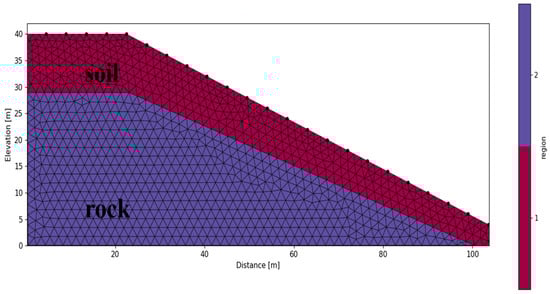 In order to verify the advantages of using arbitrary dipole–dipole configuration in landslide detection, we conducted numerical model tests. The model for the numerical study has dimensions of 107 m (length) by 40 m (depth). The profile is divided into two layers. The first layer is an irregular strip-shaped soil layer 107 m long and 11 m thick, and its resistivity varies with relatively low resistivity values. The second layer is a trapezoidal bedrock layer 98 m long and 29 m thick, with a resistivity of 1000 Ω·m. A total of 24 electrodes are arranged along the length of the profile (Figure 2).