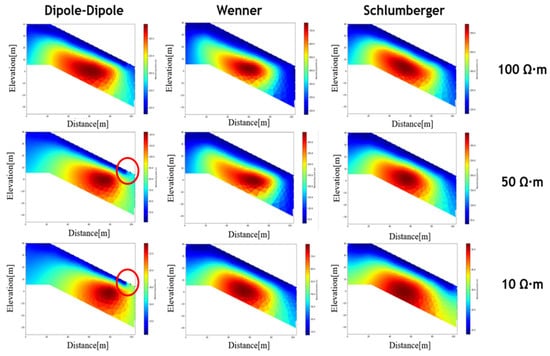 The inversion images of different arrays under different soil resistivities.
