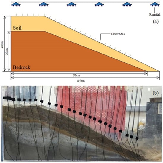 We established the soil–rock interface slope model in the laboratory to simulate the rainfall-induced landslide process (Figure 4). In total, 24 electrodes were randomly distributed on the slope. The flow rate was maintained at approximately 15 mL/s. Rainfall was applied for 5 min intervals, after which it was suspended to allow for measurements until the slope was completely damaged. The original data were inverted to obtain a series of resistivity profiles. We used the DC method to repeatedly detect the resistivity of the underground medium in the landslide body, thereby obtaining the changes in resistivity values at different locations and times. A comprehensive analysis was then performed on the resistivity value changes and their time-lag characteristics in the landslide body.