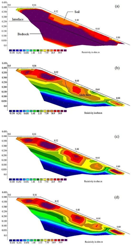 The results are shown in Figure 5. The initial resistivity is depicted in Figure 5a, indicating higher overall resistivity values in the absence of rain. After 40 min, an arc-shaped feature suspected to be the sliding face is evident (Figure 5b). Experimental findings demonstrate that the resistivity interface closely aligns with the actual position of the sliding face. Figure 5c shows a low-resistivity band with the left and right sides divided into two separate electrical bodies. At this point, a 2 mm-wide crack emerges between the 10th and 11th electrodes, signaling the onset of landslides. Then, the sliding mass has experienced significant displacement and deformation, with the widest part of the crack expanding to 2.5 cm, as shown in Figure 5d. The landslide event concluded after 128 min.