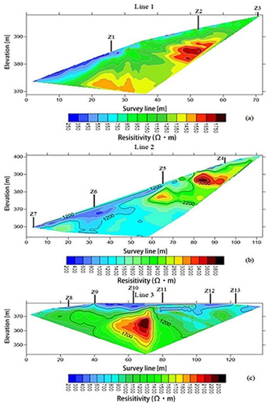 Resistivity profile of survey line. (a) results of survey line 1; (b) results of survey line 2; (c) results of survey line 3.