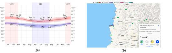 - Spark, W. Climate and Average Weather Year Round in Viña Del Mar. Available online: https://weatherspark.com/y/25809/Average-Weather-in-Viña-del-Mar-Chile-Year-Round (accessed on 24 October 2023).