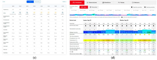 Examples of weather information in websites: (a) Weatherspark.com [47]; (b) Weather.com [48]; (c) Tiempo3.com [49]; (d) Windfinder.com [50].