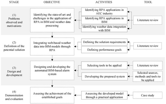 The research outlined in this work follows the Design Science Research Methodology (DSRM), which aims to develop an artifact that can solve a concrete problem within a particular context [93]. Figure 2 presents the DRSM adapted for this research addressing the aim of integrating web-based data into a BIM model with RPA composed of four stages, objectives, activities, and tools.