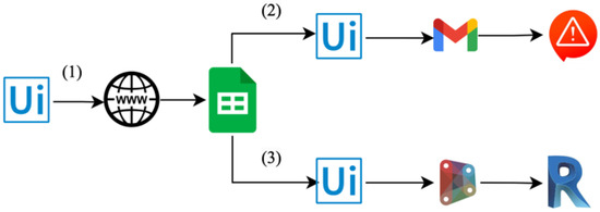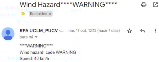 - Weather information extraction: This RPA protocol is configured to periodically access the established weather websites and extract the weather data. Then, this information is organized and stored within an Excel spreadsheet located in the Google Drive cloud (Google Sheets). This sheet is programmed with the hazardous weather criteria to identify potential alerts. It is worth noting that the frequency with which the weather information is updated varies across different sites, necessitating distinct time-triggers within the RPA program;