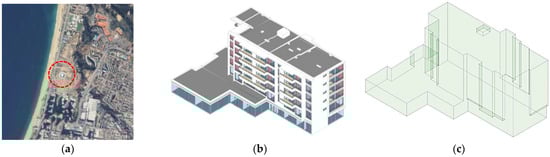 The analyzed structure is a four-story residential building located in close proximity to the sea in Viña del Mar, Chile (red circle in Figure 5a). A digital twin of this structure was modeled using the Revit software, achieving a Level of Detail (LOD) of 350. This model, presented in Figure 5b, integrates data from various disciplines, including architecture, structural engineering, and mechanical, electrical, and plumbing (MEP) systems. In order to incorporate weather information and alerts into the BIM model, a representative mass of its envelope, depicted in Figure 5c, was created.